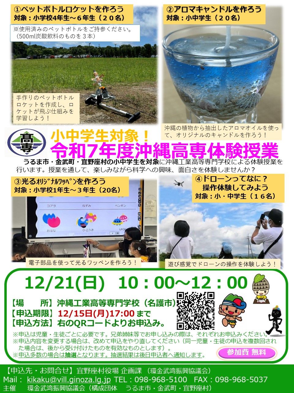 ドローンの操作やペットボトルロケット製作の体験授業など開催します。