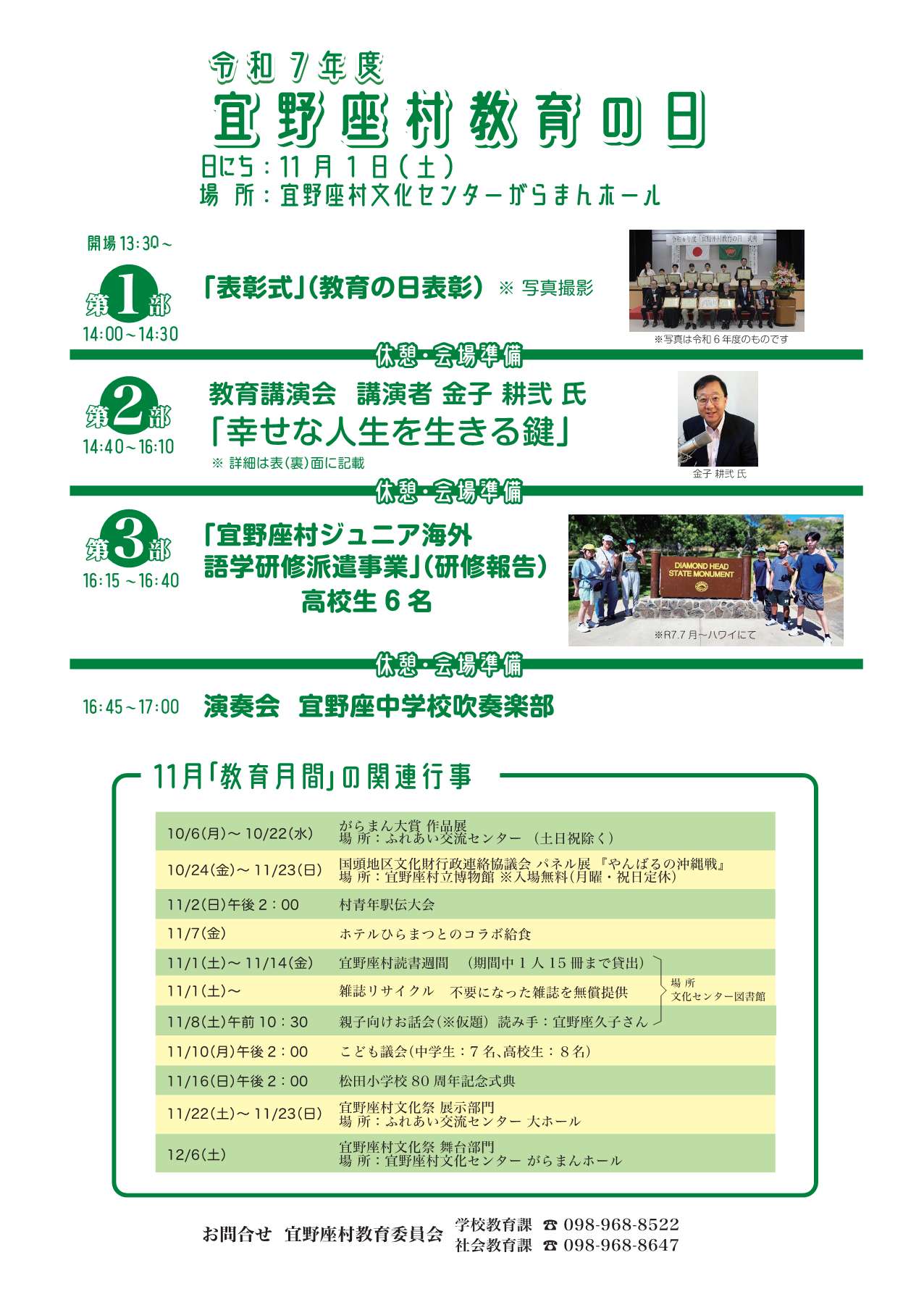 11月1日土曜日午後2時から、宜野座村文化センターがらまんホールにて、「宜野座村教育の日」式典並びに教育行事を開催します。