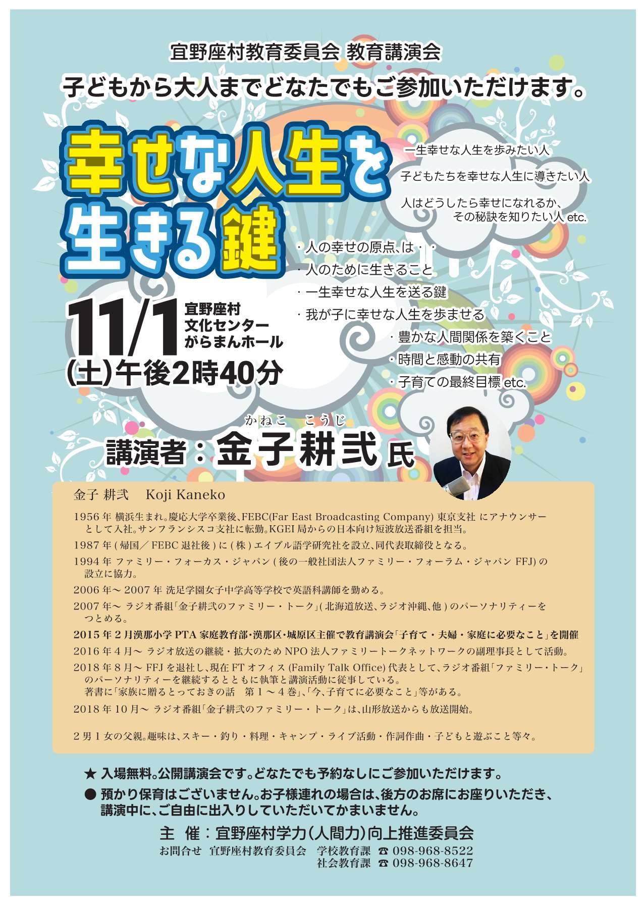 第1部の式典では、教育功労者や模範となる児童生徒の表彰を行い、第2部の講演会では、NPO法人ファミリートークネットワーク金子耕弐氏をお招きし、「幸せな人生を生きる鍵」と題してご講演いただきます。第3部では、宜野座村ジュニア海外語学研修派遣事業報告会を実施し、その後、宜野座中学校吹奏楽部による演奏会を行います。